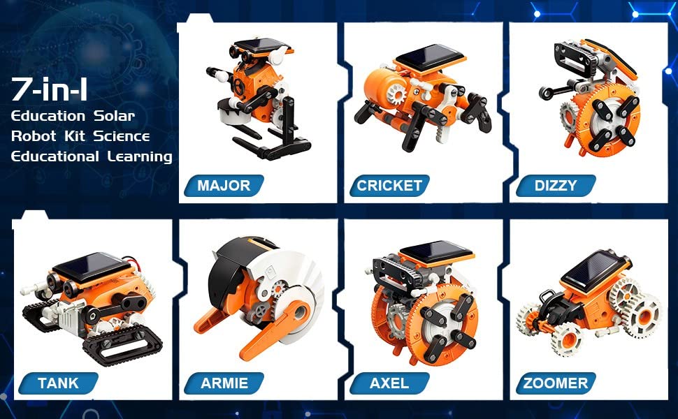 • 【مجموعات روبوت تعمل بالطاقة الشمسية 7 في 1 للأطفال】تحتاج فقط إلى مجموعة روبوت تعمل بالطاقة الشمسية لتجميع 7 أشكال وأنماط مختلفة من الروبوتات. يمكن أن يكون ذلك بسهولة وسرعة من ارمي > كريكيت > ديزي > زومر > ميجور > تانك. عندما تريد تغيير الشكل بعد التجميع، يمكنك تفكيك الأجزاء بسهولة دون إيذاء يديك. مجموعة روبوت تعمل بالطاقة الشمسية، قم ببناء مجموعة الروبوت الخاصة بك للأطفال من سن 8 إلى 12 سنة.