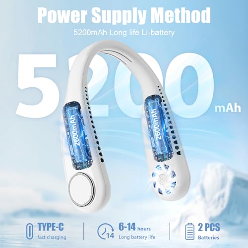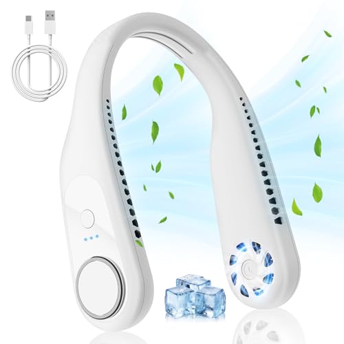 BEGKYA - مروحة محمولة للرقبة بدون شفرات قابلة لإعادة الشحن بمنفذ USB مع 3 سرعات، 5200 مللي أمبير في الساعة، صغيرة هادئة، للاستخدام الشخصي بدون استخدام اليدين للنساء والرجال من بيكيا (أبيض)