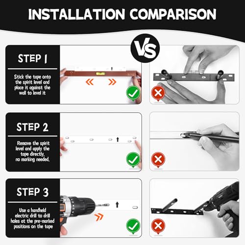 - تركيب جديد تمامًا: يتم إقران الأرفف المعلقة الخاصة بنا مع مسطرة تسوية خشبية بيهي مع ملصقات مساعدة. بالمقارنة مع طرق التركيب الأخرى التي تجعل من الصعب ثقب الثقوب، تضمن الأرفف العائمة للحمام أنه يمكنك حل مشكلة التركيب بسهولة بعد مشاهدة فيديو التركيب الخاص بنا مع تعليمات التركيب.