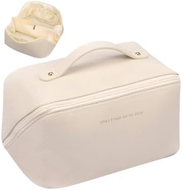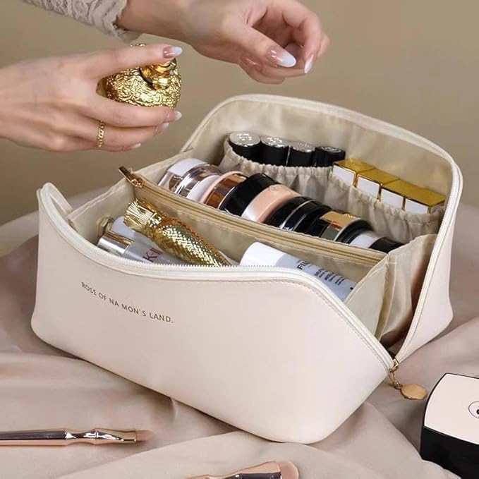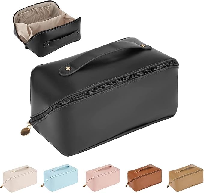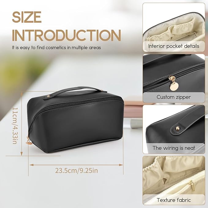 Generic - شنطة مكياج كبيرة بمقبض لتخزين ادوات الزينة والتجميل محمولة مقاومة للماء مصنوعة من جلد صناعي عالى الجودة (بيج) اسود