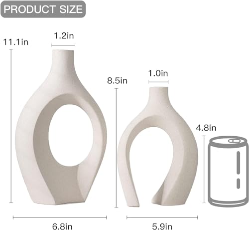- 🌷【الأبعاد】 - مزهريتان جميلتان مصنوعتان يدويًا بلون اوف وايت غير لامع، مقاس أطول (العرض 6.3 انش × الارتفاع 8 انش) فتحة الرقبة 1.3 انش، مقاس أقصر (العرض 5.4 انش × الارتفاع 7 انش) فتحة الرقبة 0.9 انش