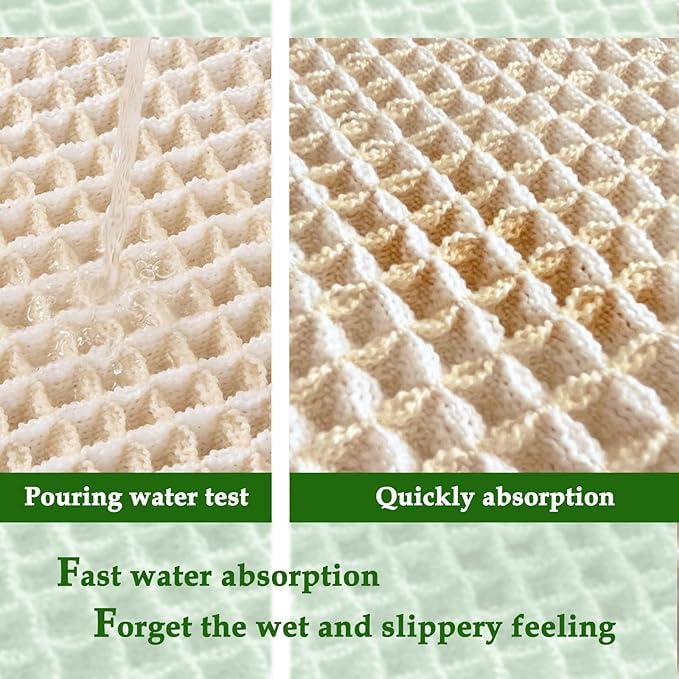 - فائقة الامتصاص نسيج وافل مزدوج الطبقة عميق، امتصاص فوري للماء، ومزود بمسامات للتهوية بعدد أكبر. عند الخروج من حوض الاستحمام أو الدش أو أثناء التحضير عند المغسلة، يمكن لقماش المايكروفايبر عالي الكثافة أن يساعد في منع انسكاب الماء على الأرض، والحفاظ على جفافها، وحماية قدميك من الأرضيات الباردة.