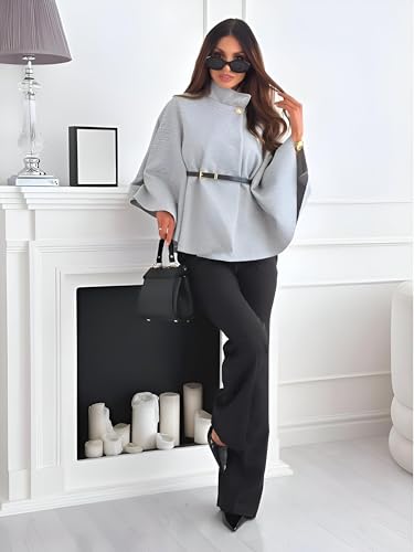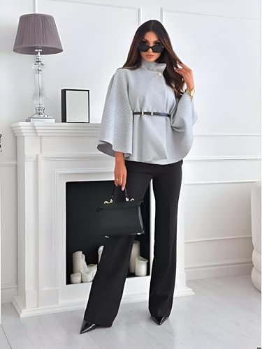 Generic - معطف من مزيج الصوف البيج - رداء انيق للنساء بقبة مدورة ونمط بونشو قصير، تصميم كم جناح الخفاش بحزام، ملابس خارجية شتوية دافئة لمظهر انيق