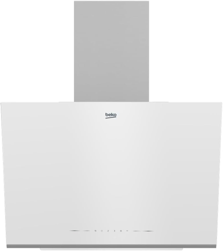 Beko - شفاط ديكور مقاس 60 سم بـ3 سرعات + سرعة قصوى واحدة وسعة من 220 إلى 720 متر مكعب/ساعة مع فلتر كربون وزجاج أبيض (إعادة تدوير داخلية وخارجية) مع تحكم باللمس من بيكو، BHCA66741BWHSE