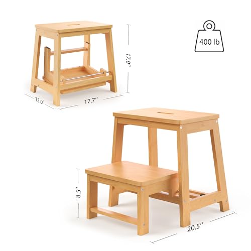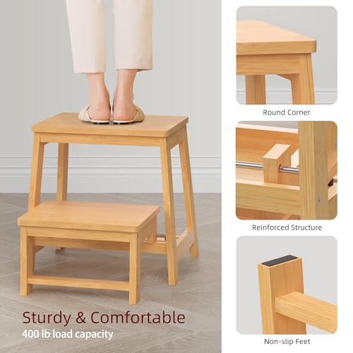 • SECURITY AND STABILITY: Wider stepping surface ensures safe standing. Sturdy structure allows the wooden step stool to safely support up to 350 pounds. It can be used for all ages, kids, adults, the elderly, pregnant women. Each foot is equipped with anti-slip pads to prevent scratches on the floor and accidental dumping. Rounded corners prevent collision injuries.