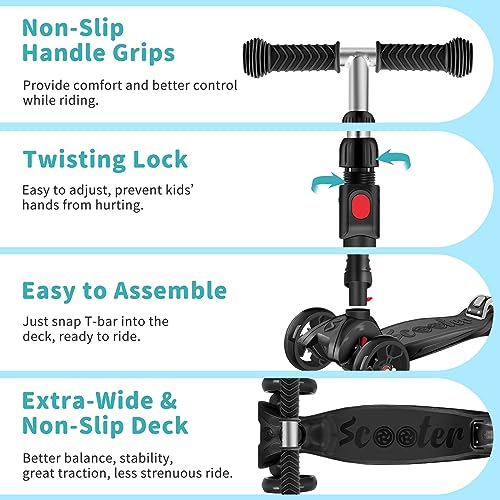 - سهل الدوران والتوقف: يحتوي السكوتر ذو العجلات الثلاثية على نظام يميل إلى التوجيه. يستخدم الأطفال وزن أجسامهم لتوجيه آمن، مما يجعل التوجيه سهلاً. تساعد الأطفال على تحسين التنسيق والتوازن والمهارات الحركية عند الركوب. توفر العجلة الخلفية الكبيرة والسميكة أسفل نظام الفرامل المصنوع من الستانلس ستيل احتكاكًا أعلى عند الكبح، مما يبطئ السكوتر بشكل فعال ويتوقف بأمان.