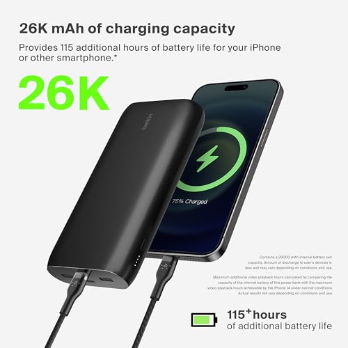 - سعة هائلة تبلغ 26000 mAh - توفر ما يصل إلى 115 ساعة من عمر البطارية الإضافي لهاتفك الذكي - بما يكفي لتشغيل أجهزتك خلال الرحلات الطويلة أو انقطاع التيار الكهربائي