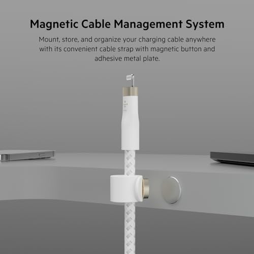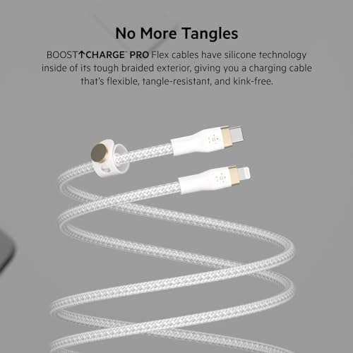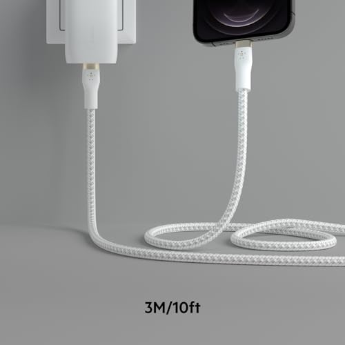 Belkin - كابل بوستشارج برو فليكس مجدول بمنفذ USB من النوع سي إلى لايتنينج بلكين 3 متر/10 قدم شحن سريع معتمد لمنتجات ابل بقدرة توصيل الطاقة 20 وات لهاتف ايفون 13 12 11 ماكس ميني ايباد–أبيض