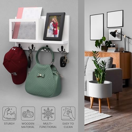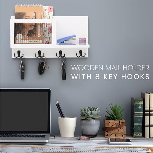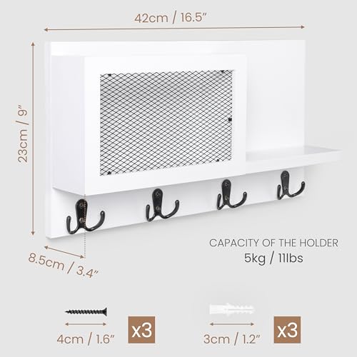 - حامل البريد والمفاتيح: حامل البريد والمفاتيح الأبيض المثبت على الحائط مثالي لتقليل الفوضى في مدخل منزلك. يبلغ مقاس الحامل 42 عرضًا × 8.5 عمقًا × 23 سم ارتفاعًا (16.5 × 3.4 × 9 انش) ويتكون من سلة تخزين ورف و8 خطافات تعليق.