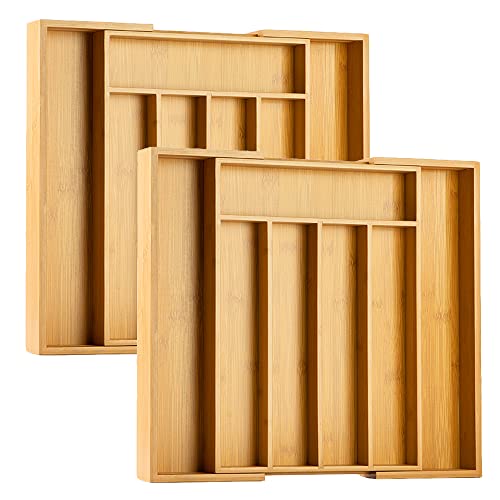 Bellsal - منظم أدوات مائدة فضية، صينية حامل منظم من البامبو بتصميم قابل للتوسيع لأدوات المطبخ وأدوات تناول الطعام لدرج المطبخ والمكتب وغرفة النوم مع قطعتين من أخاديد من بلسال