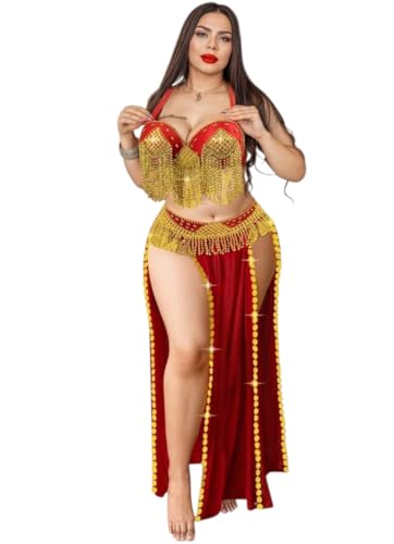 generic - بدلة رقص شرقي، طقم بلون أحمر وذهبي، تنورة طويلة مع شراشيب مقاس واحد