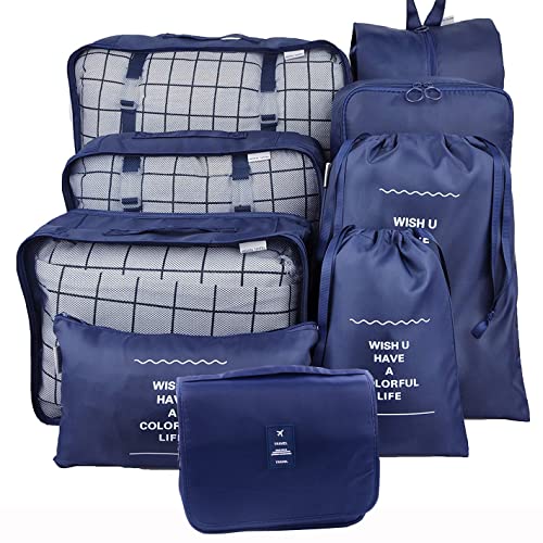 Belsmi - مجموعة من 9 قطع من مكعبات التغليف مع حقيبة أحذية - منظم أمتعة السفر الضاغطة (9 قطع أزرق داكن)