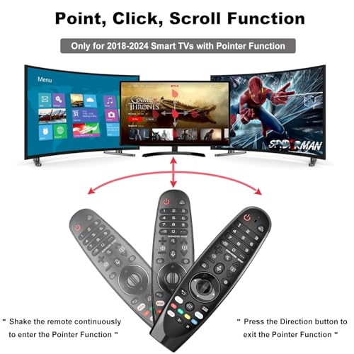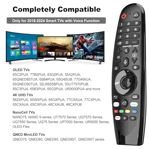 - متوافقة مع: يتوافق جهاز التحكم عن بعد الصوتي السحري هذا مع جميع أجهزة تلفزيون ال جي الذكية 2017 و2018 و2019 و2020 و2021 و2022 و2023 و2024 مع وظيفة الصوت والمؤشر. إذا كان تلفزيون ال جي الخاص بك لا يدعم وظيفة الصوت أو كان طرازًا قبل عام 2017، فقد لا تعمل وظيفة الصوت لجهاز التحكم عن بعد السحري.
