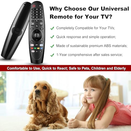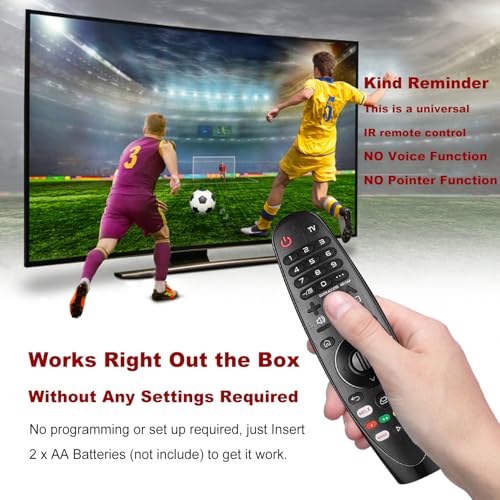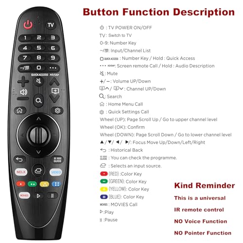 - متوافق مع جميع موديلات تلفزيون ال جي: جهاز تحكم عن بعد عالمي لجميع موديلات تلفزيون ال جي الذكي. تذكير فني: جهاز التحكم عن بعد العالمي هذا لا يحتوي على وظائف صوت أو مؤشر، ولا وظيفة صوت، ولا وظيفة مؤشر.