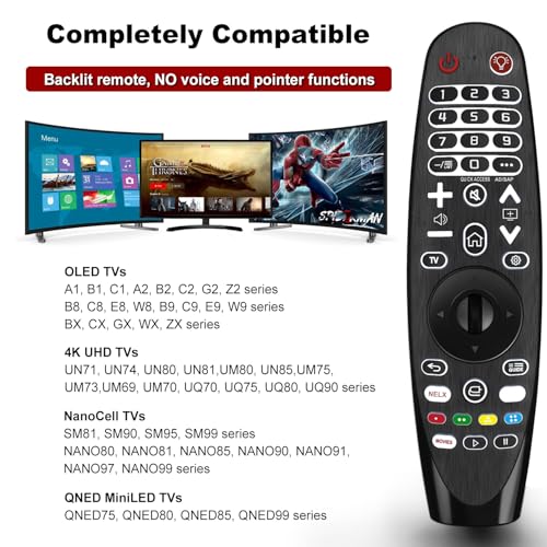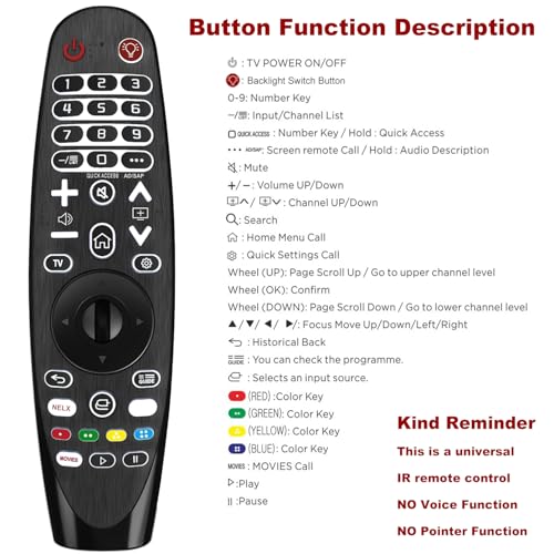 - متوافق مع جميع موديلات تلفزيون ال جي: جهاز تحكم عن بعد عالمي مع إضاءة خلفية لجميع أجهزة تلفزيون ال جي الذكية. متوافق مع جميع أجهزة التحكم عن بعد لتلفزيون ال جي الذكي. "تذكير فني: جهاز التحكم عن بعد العالمي ذو الإضاءة الخلفية هذا لا يحتوي على وظائف صوت أو مؤشر، ولا وظيفة صوت، ولا وظيفة مؤشر"
