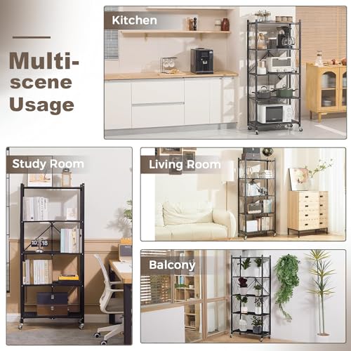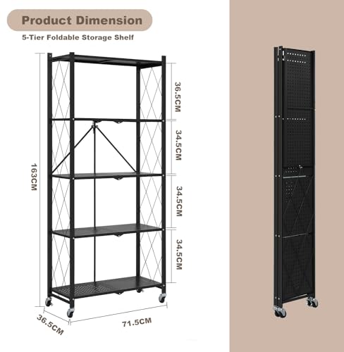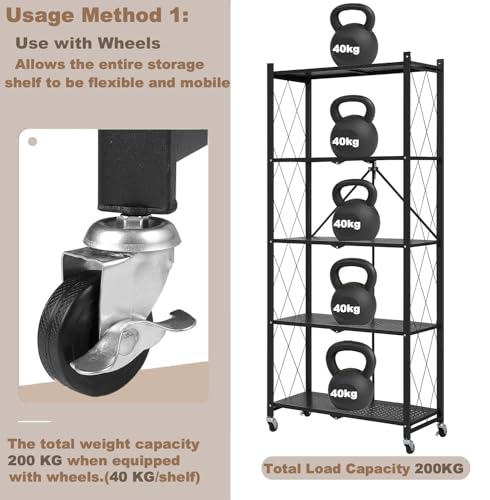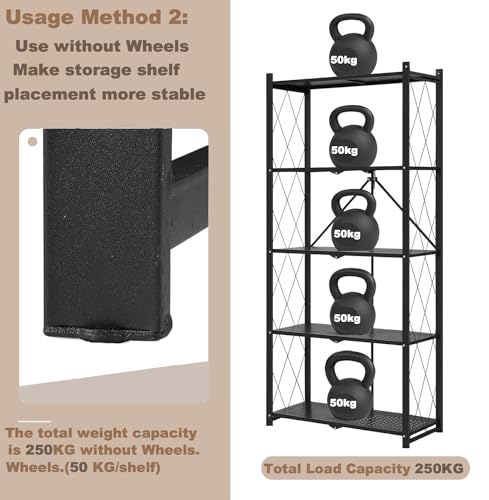 Bentifar - أرفف تخزين سميكة قابلة للطي من 5 طبقات مع عجلات، بدون تجميع، سعة كبيرة، وحدة رفوف معدنية شديدة التحمل، عربة دوارة للجراج والمطبخ والقبو والمخزن (أسود، 5 طبقات) من بنتيفار