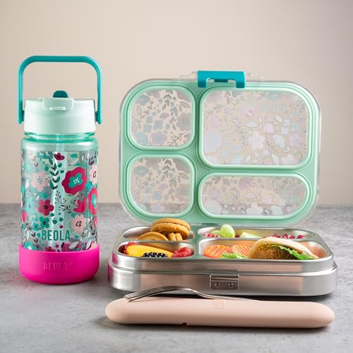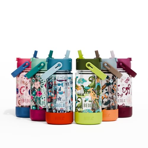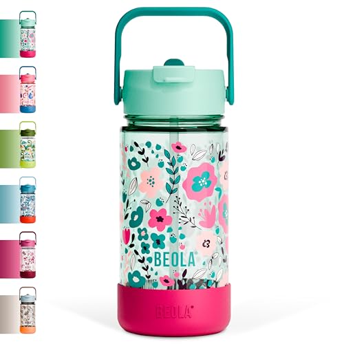 BEOLA - زجاجة مياه للأطفال مع غطاء بماصة وقاعدة واقية من السيليكون، مصنوعة من بلاستيك التريتان، خالية من البيسفينول أ وبيسفينول اس ومقاومة للتسرب والسقوط للمدرسة من بيولا (ايفر بلومينج)