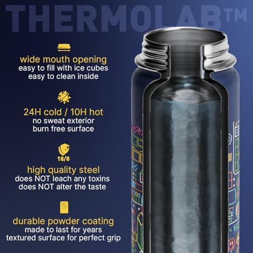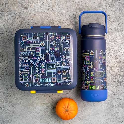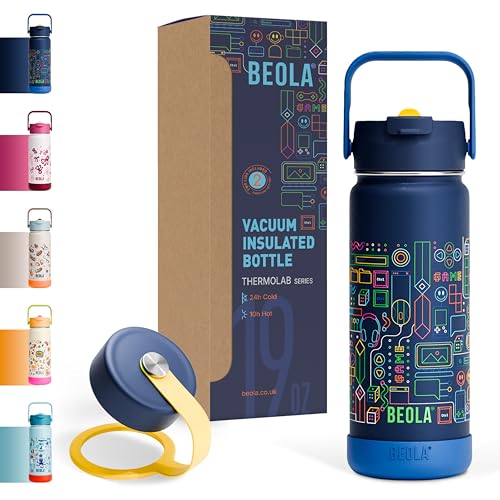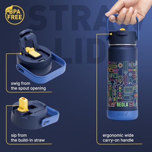 BEOLA - زجاجة مياه للأطفال من الفولاذ المقاوم للصدأ 18/8 بجدار مزدوج ومعزولة حراريًا مع شفاطة وغطاء وفوهة واسعة، زجاجة رياضية للمدرسة للسوائل الساخنة والباردة من بيولا (550 ملليلتر، بيكسل بلاي)