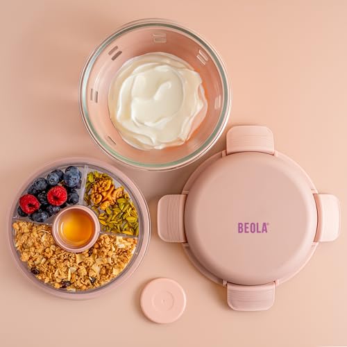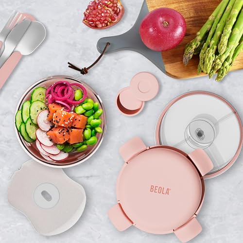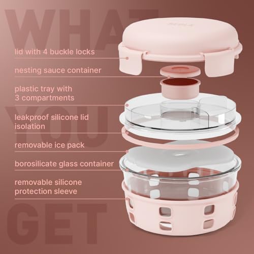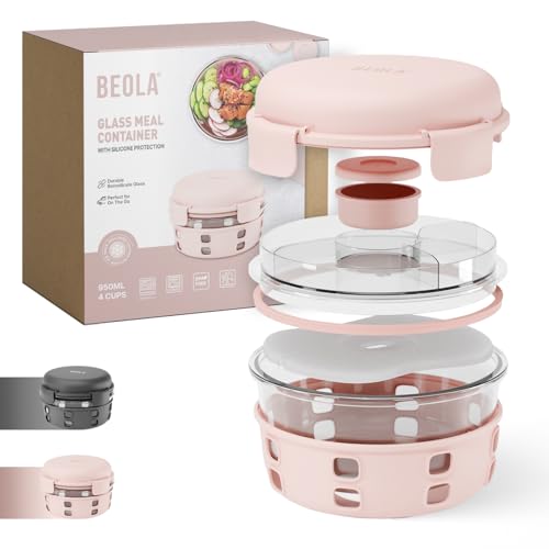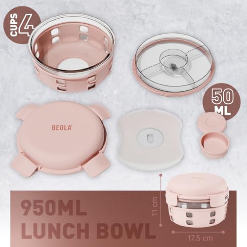 BEOLA - لانش بوكس مقسم إلى 3 أقسام مع عبوة ثلج وكوب صلصة وعلبة سلطة من زجاج البوروسيليكات الخالي من البيسفينول أ، آمن للاستخدام في الفريزر وغسالة الأطباق والميكروويف من بيولا، 950 مل، وردي (بلش بينك)
