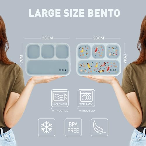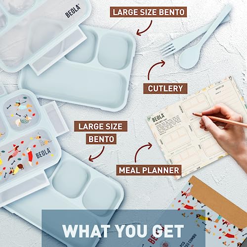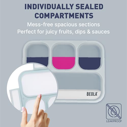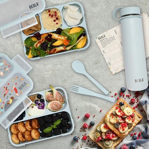 BEOLA - لانش بوكس للأطفال والبالغين بينتو متعدد الأقسام مع مخطط وجبات مغناطيسي للوجبات الخفيفة بـ 3 أو 4 أقسام خالي من مادة بيسفينول أ مع طقم أدوات مائدة من بيولا (مجموعة من 2 قطعة، لون نقط دوكسي)
