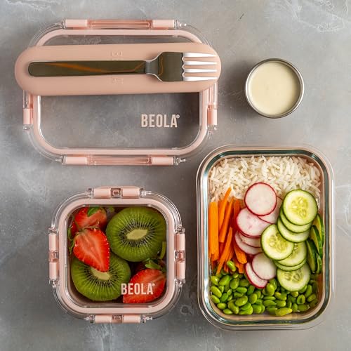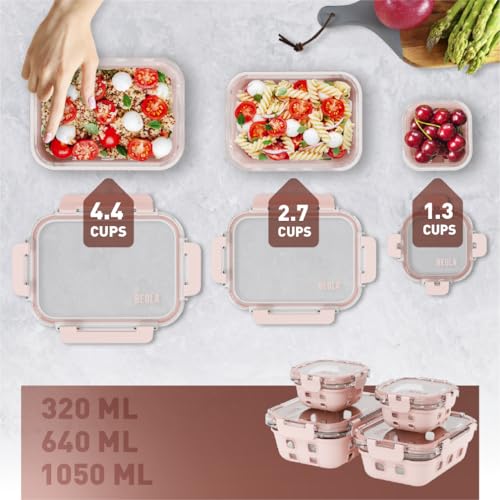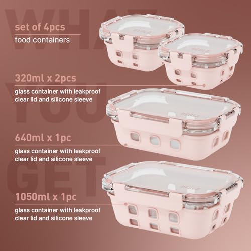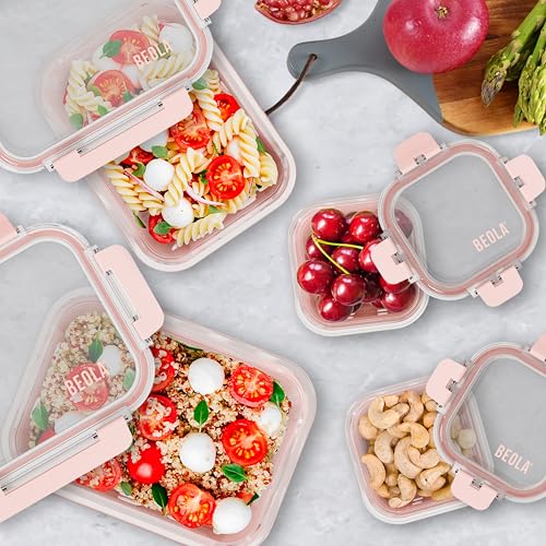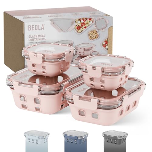 BEOLA - مجموعة من 4 حاويات تخزين طعام زجاجية مع أغطية محكمة الغلق وحماية السيليكون بيولا منظم مانع للتسرب وآمن للاستخدام في الفريزر وغسالة الصحون والميكروويف خالي البيسفينول أ بينك بلش