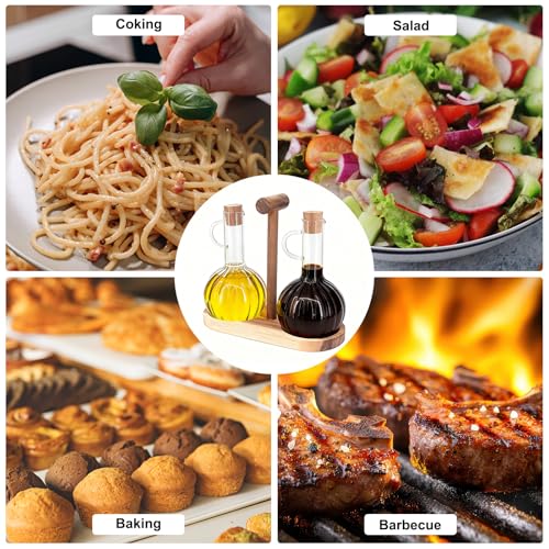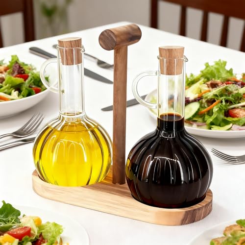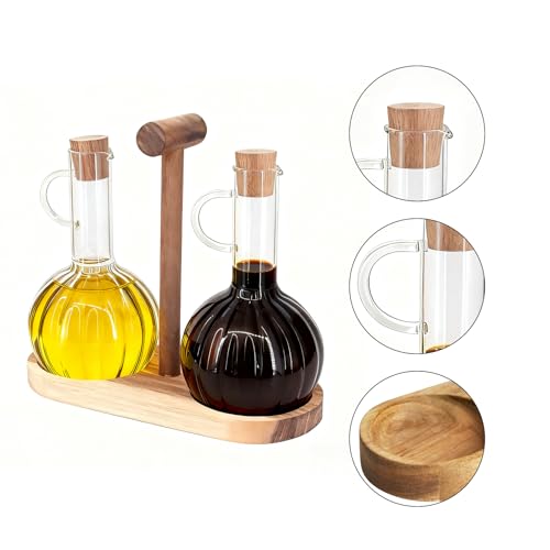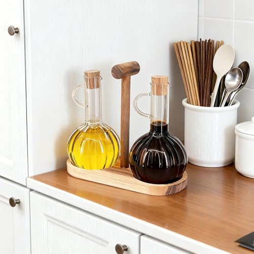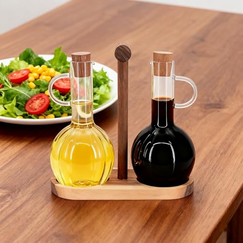 Beowanzk - مجموعة موزع الزيت والخل من قطعتين من بيوانزك مع حامل خشبي، زجاجة موزع زيت زيتون 300 مل وزجاجات خل، زجاجات توزيع زجاجية للمطبخ مقاومة للحرارة