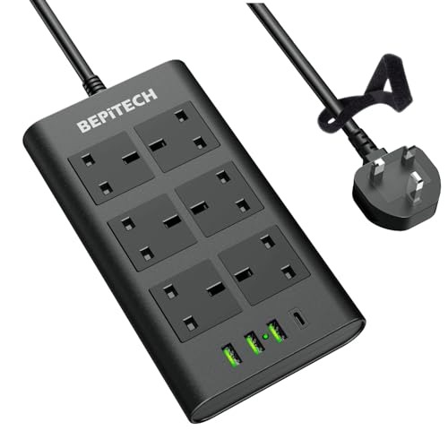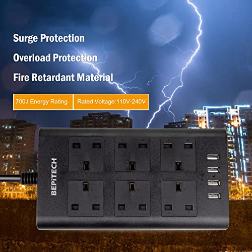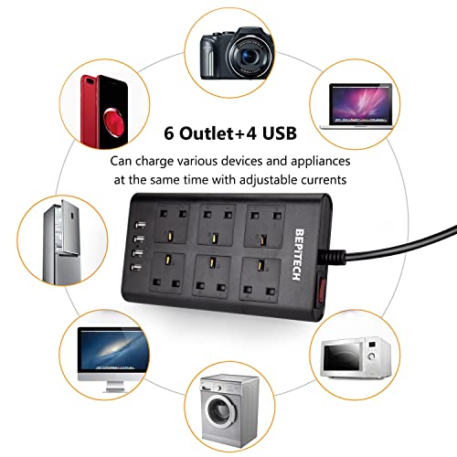 BEPiTECH - سلك تمديد 6 مقابس مع 4 منافذ USB للحماية من تدفق التيار، قاعدة شحن متعددة المقابس، وصلة كهرباء مسطحة بطول 2 م للتابلت وأجهزة اللاب توب والمطبخ والمكتب والمنزل من بيبي تيك (2 USB نوع A)