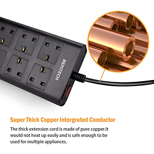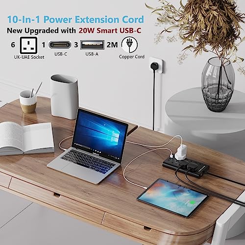 - 【تشغيل عشرة منافذ طاقة من مقبس واحد】 تحتوي هذه الوصلة الكهربائية على 6 مقابس تيار متردد و4 منافذ USB ذكية. توفر المنافذ الستة للطاقة قوة 2500 وات / 10 أمبير عبر سلك كهرباء بطول 2 م مصنوع من النحاس الخالص ومناسبة لأجهزة سطح المكتب ومساحات العمل ومراكز الترفيه المنزلية والمطبخ والفنادق أو المكتب. توفر قاعدة الشحن المزودة بأربعة منافذ USB تيارًا يبلغ 2.4 أمبير (الإجمالي). يمكنها الشحن تلقائيًا للأجهزة الإلكترونية مثل آيفون والتابلت والكاميرات الديجيتال وغيرها المزيد.