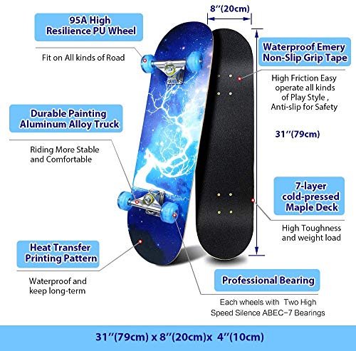 - [مادة لاصقة] 7 طبقات 31.5 انش طول × 8 بوصة عرض × 4 بوصة ارتفاع (80 طول × 20 عرض × 10 سم ارتفاع)، خشب القيقب يجعل السطح الخشبي متينًا للغاية ويمكنه تحمل وزن 160 كجم، عجلات من البولي يوريثان فائقة النعومة تقطع التخميد عند الركوب، توفر الشاحنة المصنوعة من خليط معدني هيكلًا أكثر ثباتًا للوح التزلج، محامل ABEC-7 تجعل عجلات تدور بشكل أكثر سلاسة، النمط: نقل الحرارة (الذي تمت طباعته على اللوحة، وليس الملصق.) يجعل النمط متينًا لفترة طويلة.