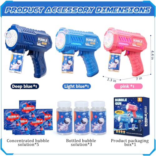 - مجموعة نابضة بالحياة من 3 قطع: تأتي مع 3 مسدسات فقاعات كهربائية باللون الأزرق والوردي والأزرق الداكن. مثالية للمشاركة مع الأصدقاء أو الأشقاء، مما يضمن انضمام الجميع إلى الفقاعات - مما يثير الإثارة.