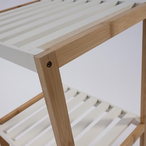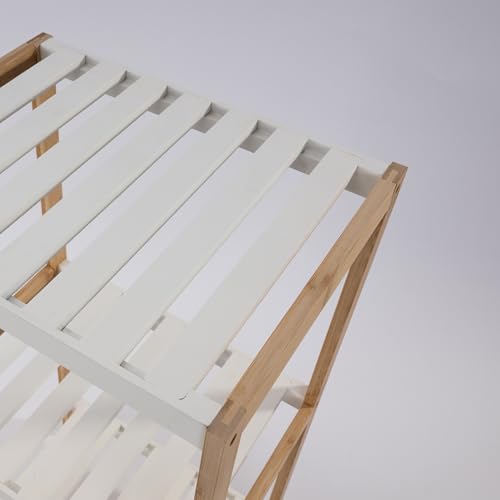 - يوفر هذا الرف المكون من رفين تصميمًا بسيطًا يجمع بين الهيكل الطبيعي للخيزران مع رفين أبيضين وتصميم شرائح مع لمسة نهائية لامعة.