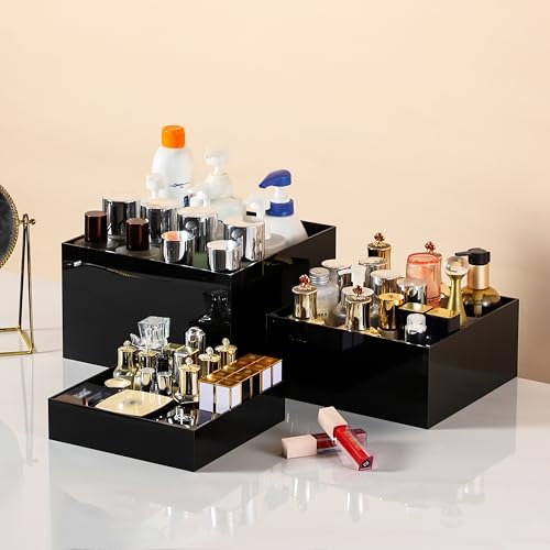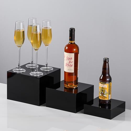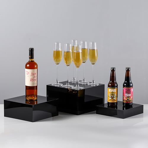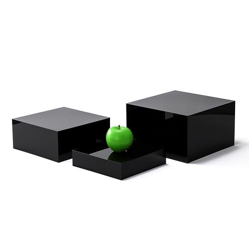 BM Best Media Advertising and Industrial Services - مجموعة حامل عرض اكريليك اسود لامع من 3 قطع من بيست ميديا لتقديم الطعام، حوامل بوفيه متداخلة للطعام والحلوى والحفلات - عصرية - مجموعة من 3 قطع - اسود