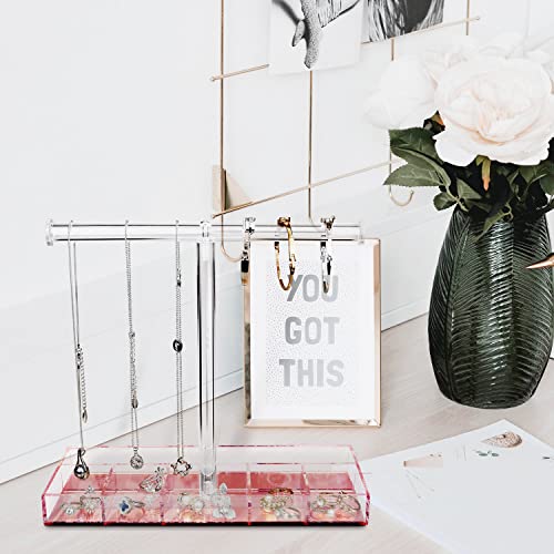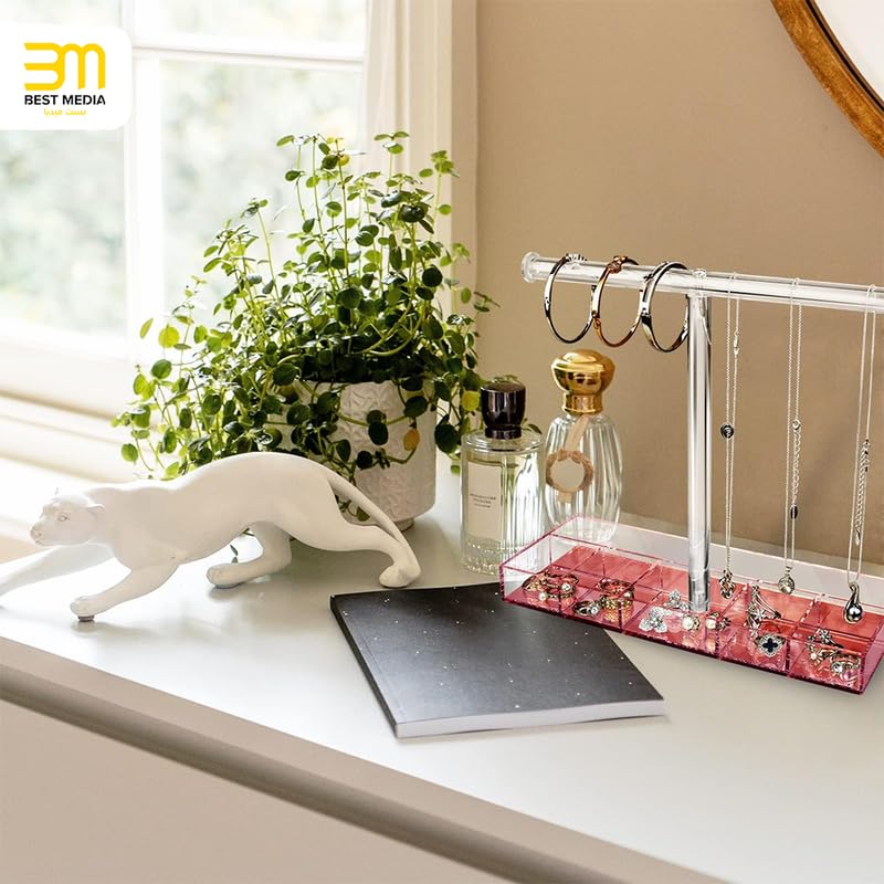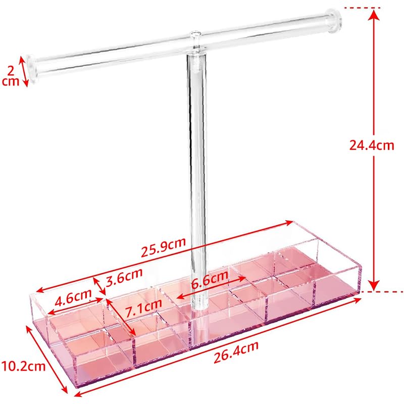 - قضيب مزدوج على شكل حرف T للتعليق: يوفّر حامل الـ T ذو المستويين مساحة واسعة لتعليق وعرض الأساور والقطع القصيرة، مما يحافظ عليها منظمة وخالية من التشابك.