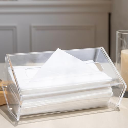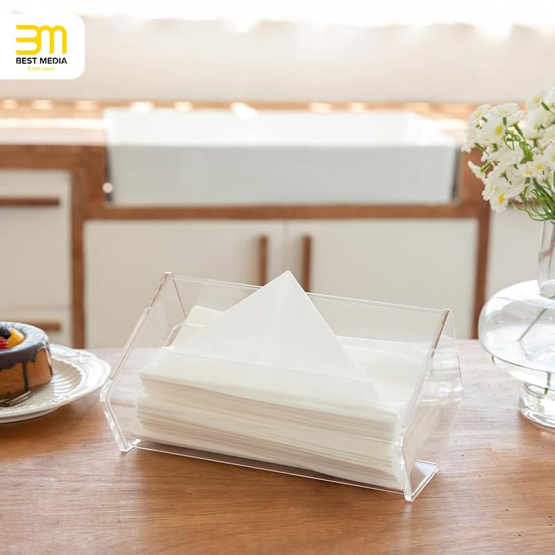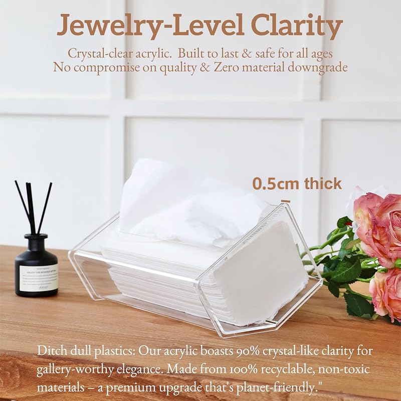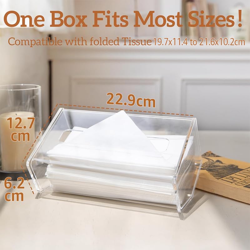 BM Best Media Advertising and Industrial Services - حامل علبة مناديل اكريليك من بيست ميديا، غطاء قابل للامالة بزاوية 27 درجة، موزع مناديل فريد من نوعه، لطاولة الحمام ومنضدة غرفة النوم والمكتب وديكور المنزل العصري، 23 طول × 13 عرض × 6 سم ارتفاع، شفاف