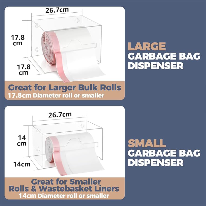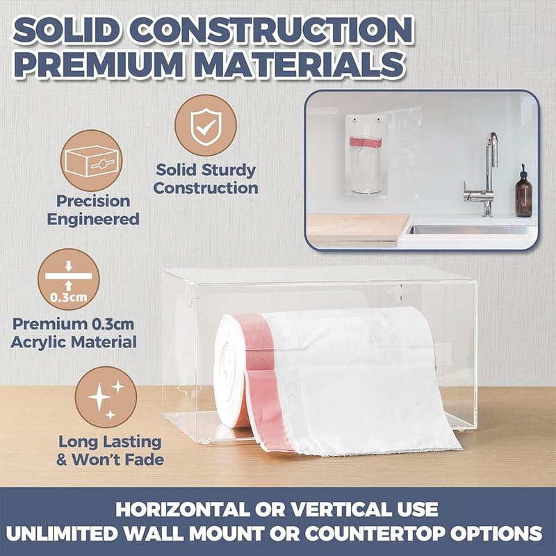 - تنظيم أكياس القمامة المريح: حافظ على أكياس القمامة مخزنة بدقة ويسهل الوصول إليها باستخدام موزع الأكريليك الشفاف هذا - مثالي للمطابخ أو المكاتب أو المتاجر أو محطات التنظيف.