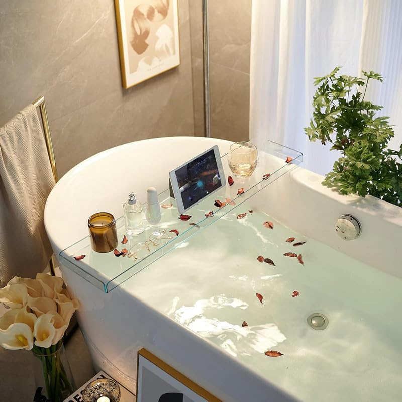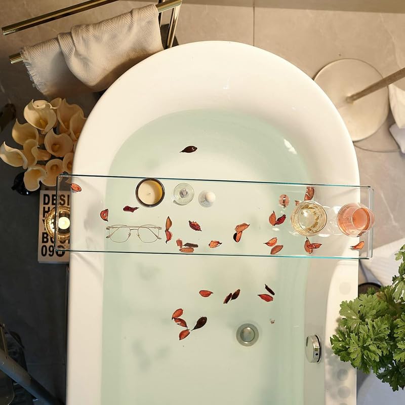 - صينية حوض استحمام فاخرة من الأكريليك: مصممة لتمتد بأناقة حوض الاستحمام الخاص بك، مما يوفر سطحًا أنيقًا وعمليًا لحمل الأجهزة اللوحية والكتب والنبيذ والشموع وأدوات النظافة أثناء الاستحمام المريح. يضيف لمسة من الفخامة إلى حمامك.