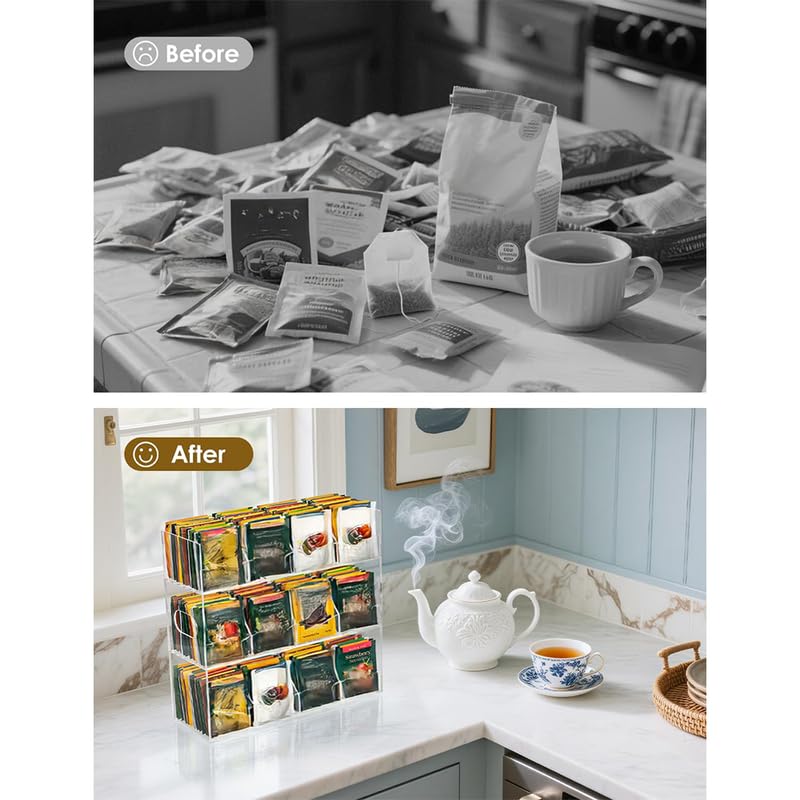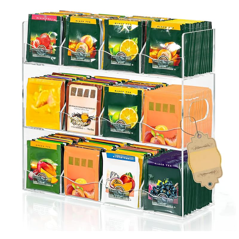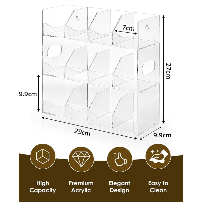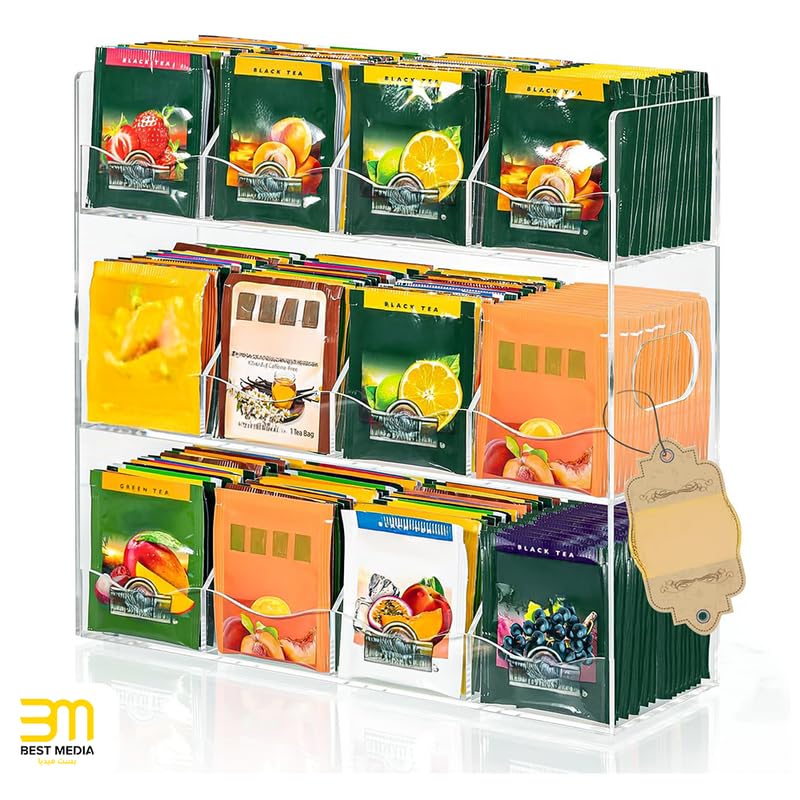 BM Best Media Advertising and Industrial Services - منظّم أكياس شاي من الأكريليك الشفاف من بيست ميديا، للاستخدام على سطح المطبخ أو للتثبيت على الحائط، صندوق تخزين يتسع لأكثر من 216 كيس شاي، بـ 9 أقسام وتصميم حواف أنيق، لخزائن المطبخ والمخزن.