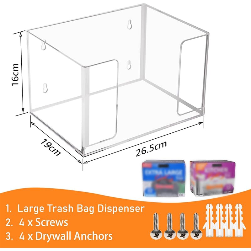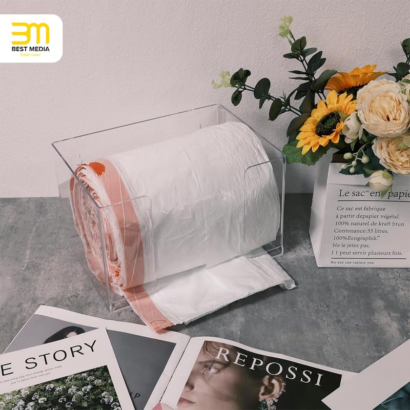 BM Best Media Advertising and Industrial Services - حامل اكياس قمامة اكريليك كبير جدا من بيست ميديا، حامل يثبت على الحائط لاكياس القمامة والتسوق، صندوق تخزين بلاستيكي شفاف بتصميم فتحة امامية، 26.5 × 19 × 16 سم، شفاف