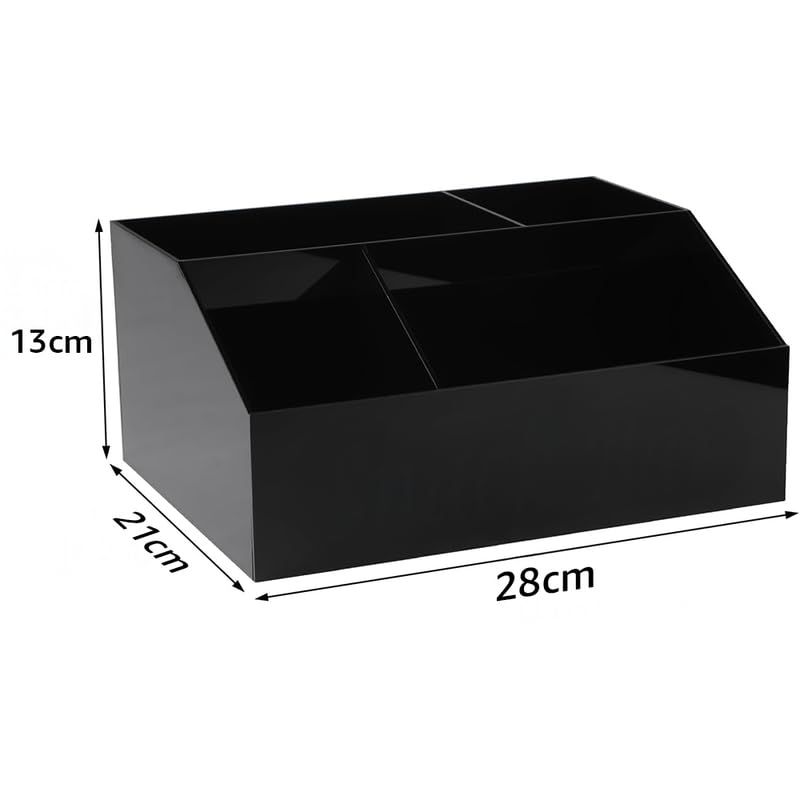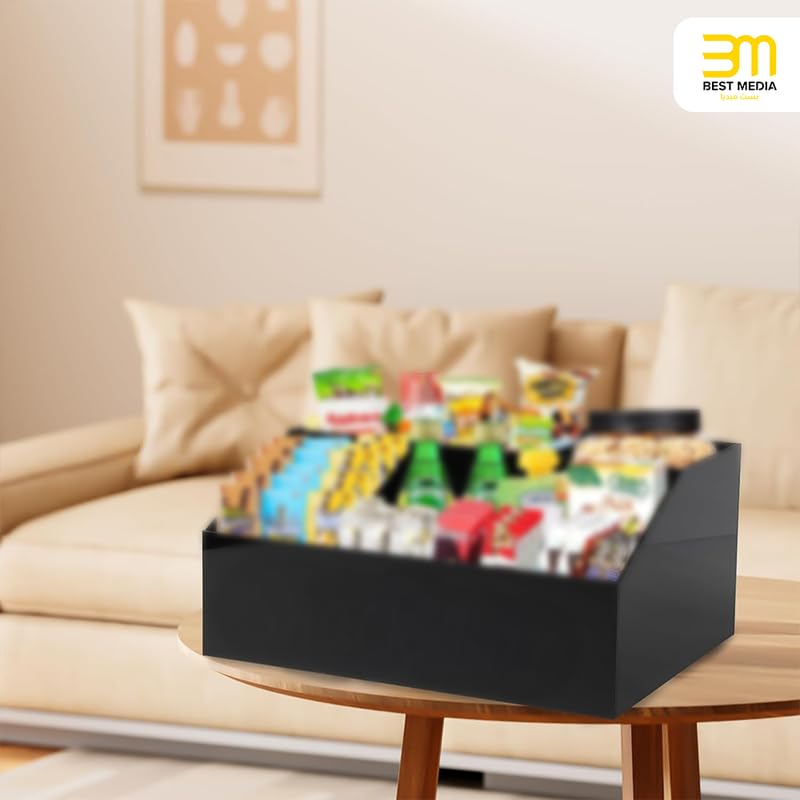 BM Best Media Advertising and Industrial Services - منظم وجبات خفيفة لسطح الطاولة من بيست ميديا، محطة تخزين اكريليك سوداء مع 4 مساحات تخزين للمطبخ او المخزن او المكتب، صندوق عرض الوجبات الخفيفة والمشروبات للرقائق والزجاجات، لمسة نهائية لامعة، اسود