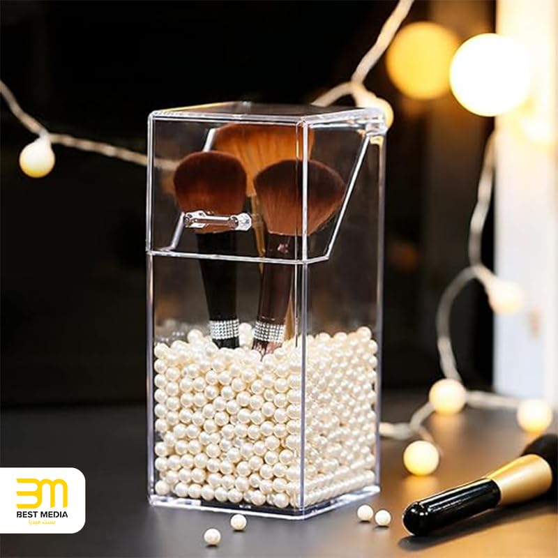 BM Best Media Advertising and Industrial Services - حامل فرش مكياج اكريليك شفاف مع غطاء ولؤلؤ ابيض، منظم مستحضرات تجميل انيق لطاولة الزينة الخاصة بك - انيق - قطعة واحدة - شفاف من بيست ميديا