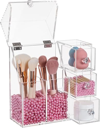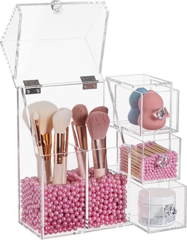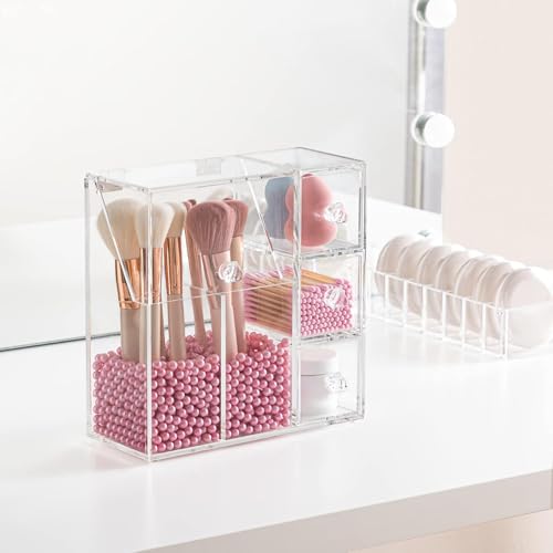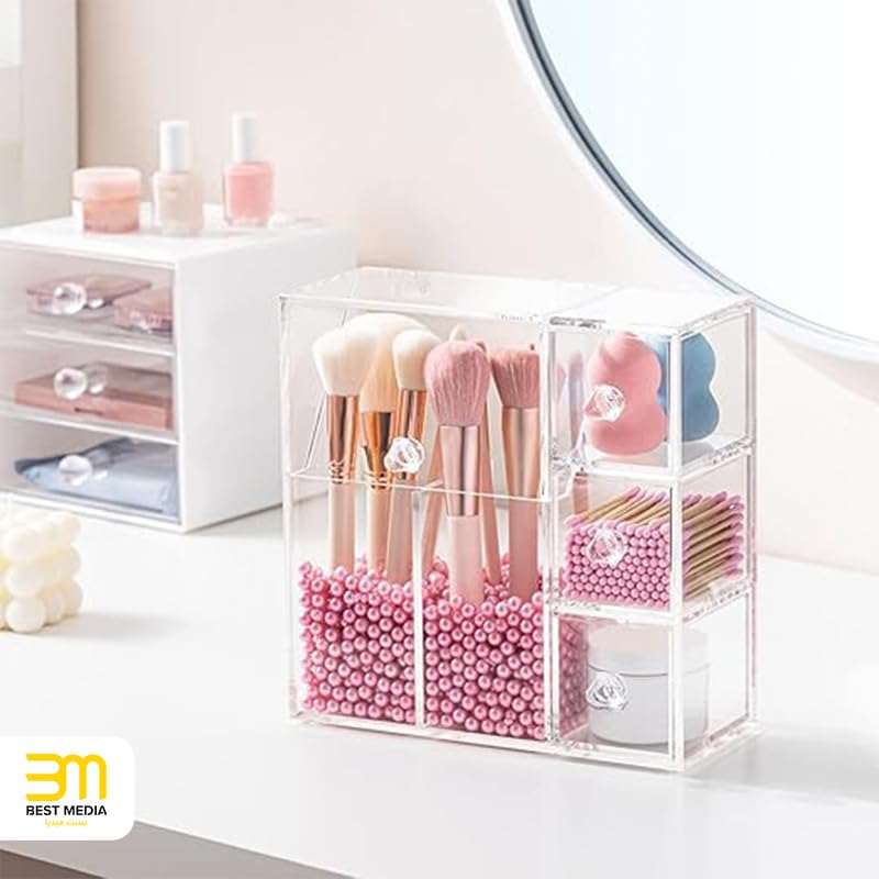 BM Best Media Advertising and Industrial Services - منظم مكياج اكريليك شفاف مع 2 حامل فرش و3 أدراج، صندوق تخزين مستحضرات التجميل مقاوم للغبار مع لؤلؤ زهري بمظهر عصري من بيست ميديا، قطعة واحدة - شفاف