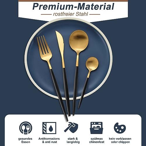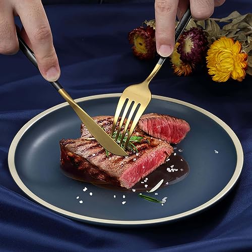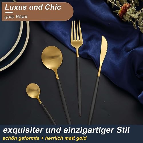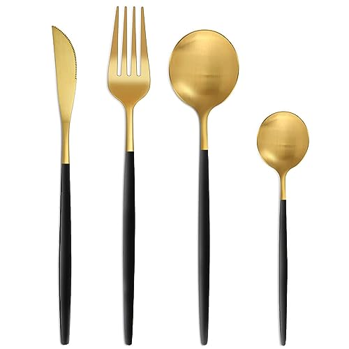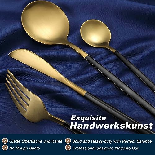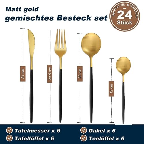 Bestdin - طقم أدوات مائدة يكفي 6 أشخاص من بيست دين، 24 قطعة، أدوات مائدة متعددة الألوان مع شوكة سكين، أدوات مائدة من الفولاذ المقاوم للصدأ، آمن للاستخدام في غسالة الأطباق، أسود وذهبي غير لامع