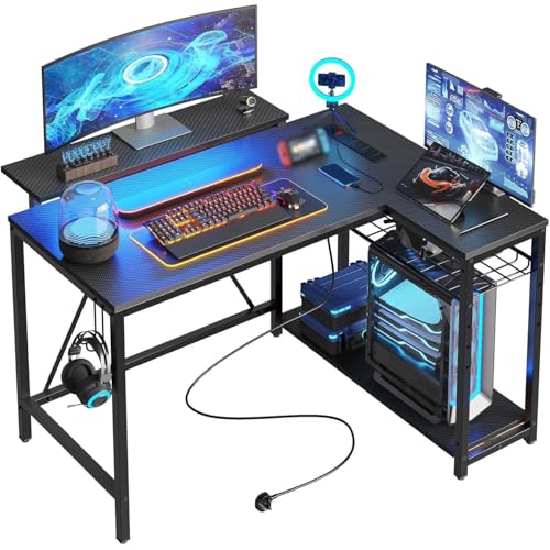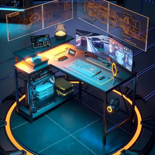 Bestier - مكتب كمبيوتر زاوي على شكل حرف L منزلي صغير مزود بمنافذ طاقة وشريط إضاءة ار بي جي بتصميم قابل للعكس مع رفوف وخطافات مناسب للمساحات الصغيرة 1 م من بيستير