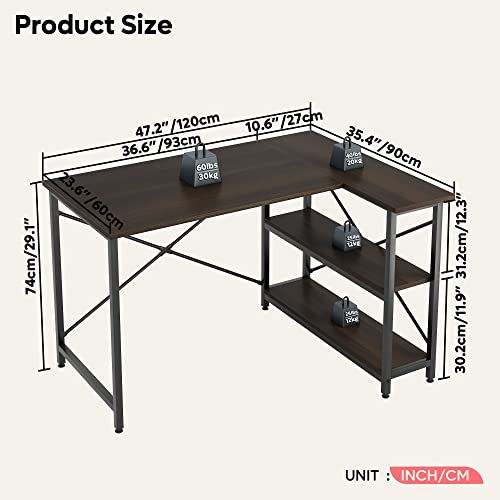 Bestier - مكتب صغير على شكل حرف L مع أرفف تخزين من بيستير، مكتب زاوية 119 سم مع أرفف، طاولة مكتب للكتابة مع رف تخزين مكتب منزلي للمساحات الصغيرة، خشب بي 2 (بني، 119 سم)