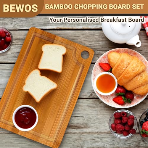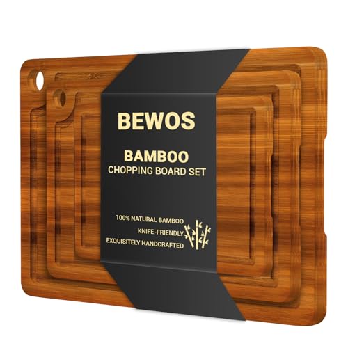 BEWOS - مجموعة الواح تقطيع خشبية من 3 قطع مع فتحة تعليق من بيوس - الواح تقطيع من الخيزران بمقابض واخاديد للعصائر، لوح تقطيع خشبي للمطبخ، مثالي لتقطيع اللحوم والخضروات والجبن والخبز