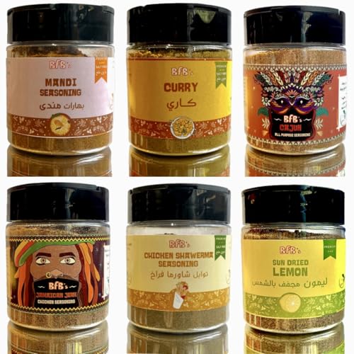 - مجموعة كاملة: مجموعة توابل فاخرة تتميز بستة توابل مميزة - ماندي وكاري وكاجون وجامايكا جيرك وشاورما الدجاج ومساحيق الليمون المجفف بالشمس