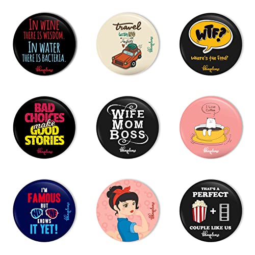 Bhai Please - شارة دبوس من بي هاي من فضلك (عبوة من 9 قطع) بعبارة "Wine There is Wisdom, Travel with No Regrets, , Bad Choices Good Stories, Wife Mom Boss, Bear in Cup I'm Famous, Girl Power، Perfect Couple