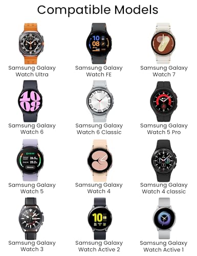 - تصميم مناسب لساعة سامسونج: متوافق مع ساعة جالاكسي ووتش الترا (47 ملم SM-L705U)، جالاكسي ووتش اف اي (40 ملم SM-R861)، جالاكسي ووتش 7 (40 ملم SM-L300NZ)، جالاكسي ووتش 7 (44 ملم SM-L310NZ)، جالاكسي ووتش 6 40 ملم/44 ملم، جالاكسي ووتش 6 كلاسيك 43 ملم/47 ملم، جالاكسي ووتش 5 برو 45 ملم (SM-R920)، ووتش 5 40 ملم (SM-R900)، ووتش 5 44 ملم (SM-R910)؛ ووتش 4 40 ملم (SM-R860)، ووتش 4 44 ملم (SM-R870/SM-875)، ووتش 4 كلاسيك 42 ملم (SM-R880)، ووتش 4 كلاسيك 46 ملم (SM-R890/SM-R895) ووتش 3 4 1 ملم (SM-R850)، ووتش 3 45 ملم (SM-R840)، جالاكسي ووتش اكتيف 1 40 ملم (SM-R500)، جالاكسي ووتش اكتيف 2 40 ملم (SM-R830)/2 44 ملم (SM-R820)؛ (غير متوافق مع جير S2/S3/S4).