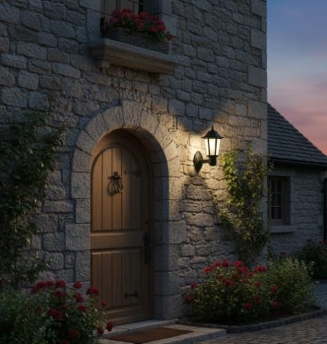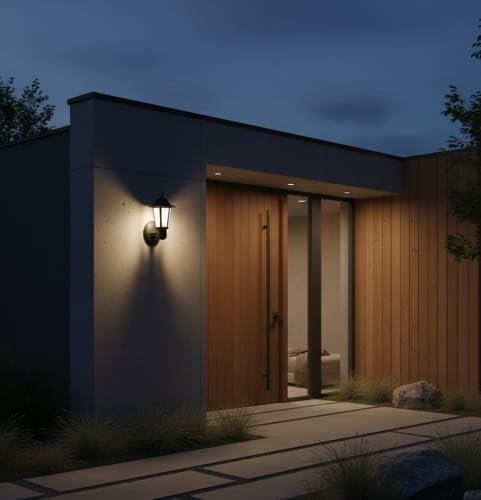 • إضاءة الحديقة: لمبة ليد خارجية عصرية للبوابة بتصميم بغطاء علوي مغلق مناسب للمدخل والحائط الفاصل ومناطق وجود الأعمدة والحديقة.