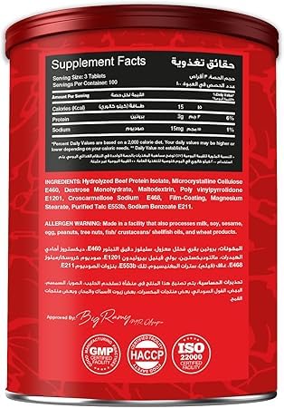 - 1 جم أحماض أمينية من اللحم البقري لكل قرص.